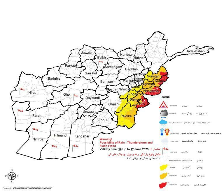ریاست هواشناسی  روز یک‌شنبه، ۴ تیر/ سرطان، با نشر خبرنامه‌ای نوشته است که این احتمال به روزهای ۵ و ۶ جوزای سال روان در استان‌های نورستان، کنر، لغمان، ننگرهار، لوگر، پکتیا، خوست، پکتیکا، غزنی و میدان‌وردک وجود دارد.