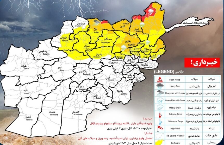 ام‌روز پنج‌شنبه ۲ حمل/فروردین، ریاست هواشناسی وزارت ترانسپورت گروه طالبان در خبرنامه‌ای نگاشته است که دراستان‌های بدخشان، تخار، کندز، بلخ، بغلان، پنج‌شیر، کاپیسا، لغمان، نورستان، پروان، سمنگان، بامیان، سرپل، جوزجان، غور و سالنگ‌ها احتمال برف‌باری و باران شدید وجود دارد.