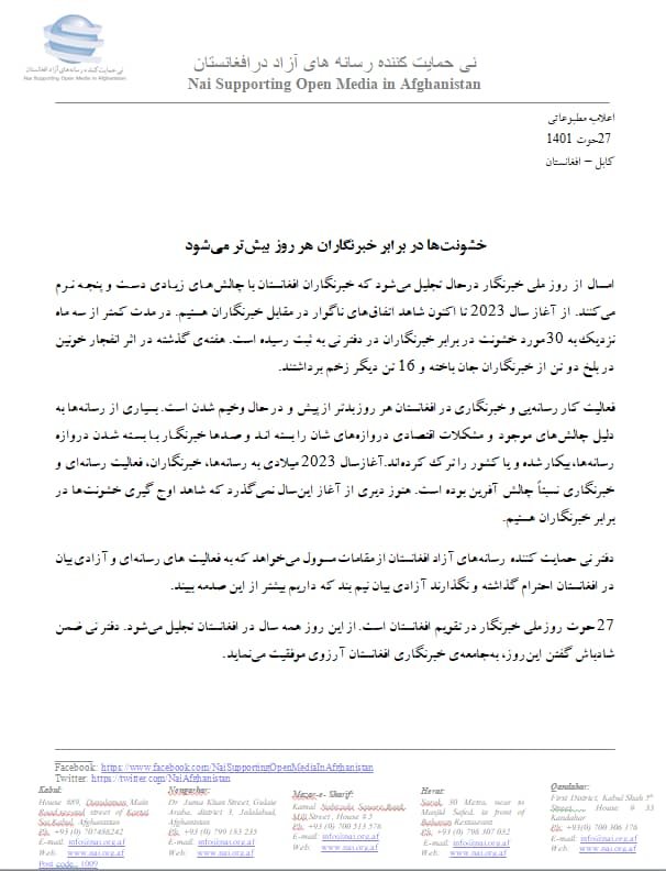 در اعلامیهای که از سوی دفتر نی به نشر رسیده آمده است:« امسال از روز ملی خبرنگار درحال تجلیل میشود که خبرنگاران افغانستان با چالشهای زیادی دست و پنجه نرم میکنند. از آغاز سال 2023 میلادی تا اکنون شاهد اتفاقهای ناگوار در مقابل خبرنگاران هستیم. در مدت کمتر از سه ماه نزدیک به 30 مورد خشونت در برابر خبرنگاران در دفتر نی به ثبت رسیده است.»