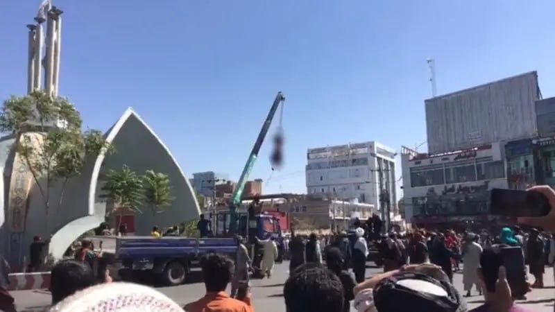 خبرگزاری راسک: نوار تصویریکه که منابع محلی از استان هرات فرستادهاند نشان میدهد گروه طالبان، سه نظامی پیشین را به دار آویخته و آنها را در سطح شهر، میچرخانند.