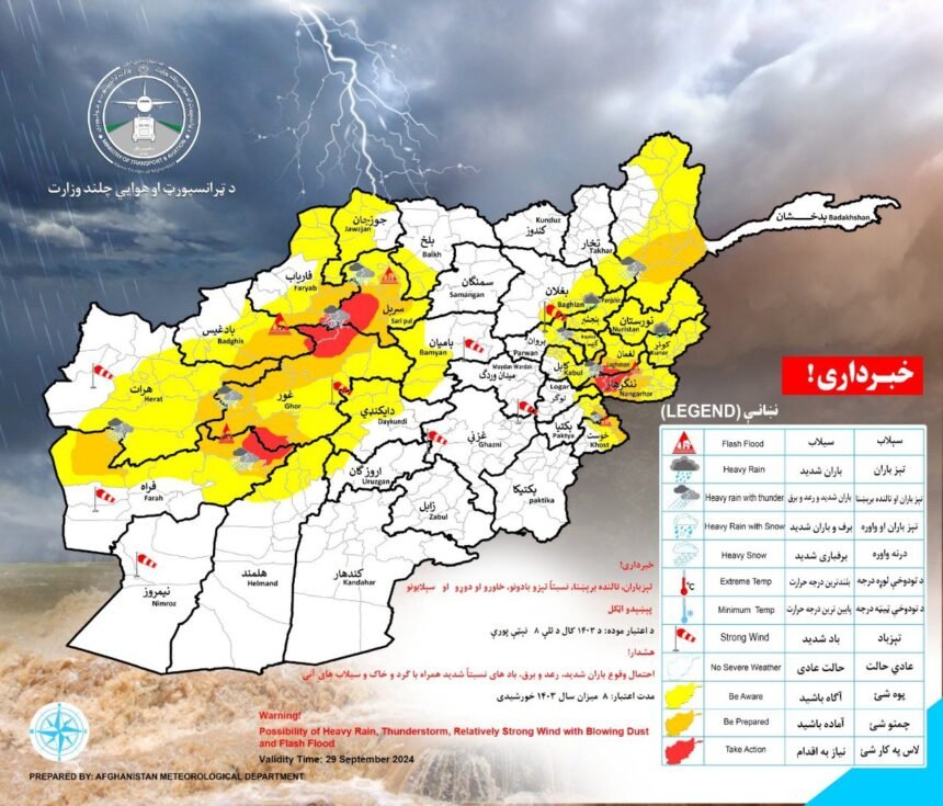 این ریاست در یک خبرنامه گفته استکه این احتمال فردا، ۸ میزان، در استانهای بدخشان، تخار، پنجشیر، نورستان، لغمان، کنر، ننگرهار، بغلان، کاپیسا، پروان، کابل، لوگر، پکتیا، خوست، بامیان، سرپل، بلخ، جوزجان، فاریاب، بادغیس، غور، دایکندی، اروزگان، هلمند، فراه و هرات وجود دارد.