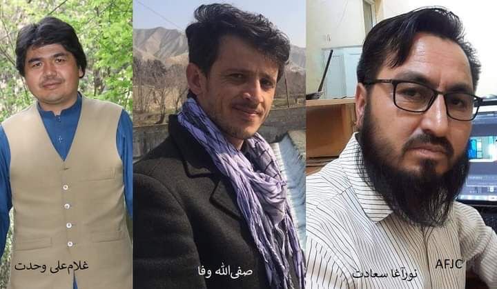 این نهاد حمایت از رسانههای آزاد افغانستان از خبرنگاران بازداشت شده بهنامهای غلام علی وحدت، خبرنگار تلویزیون محلی تنویر؛ سید نور آغا و صفی الله، خبرنگار و تصویر بردار تلویزیون ملی یاد کرد و گفت که روز چهار شنبه 16 فروردین/ حمل، از سوی نیروهای طالبان در بغلان بازداشت شده اند.