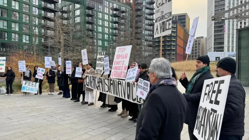 این تجمع روز دوشنبه از سوی انجمن افغانستان و آسیای میانه با حضور فعالان حقوقبشر و پناهجویان افغانستانی برگزار شده است. نورالحق نسیمی، بنیانگذار انجمن افغانستان و آسیای میانه در بیانیهای گفت: «حکومت طالبان حقوق اولیه مردم افغانستان را نابود کرده است.»