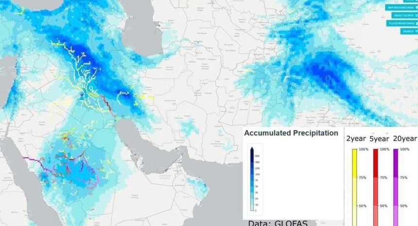 قرار تخمین های سیستم جهانی پیش بینی سیلاب؛ کشور های عربستان سعودی؛ عراق؛ سوریه و غرب ایران شاهد سیلاب تا شدت بیست ساله یعنی سیلابی که یکبار در ۲۰ سال بوقوع می پیوندد، خواهند بود.