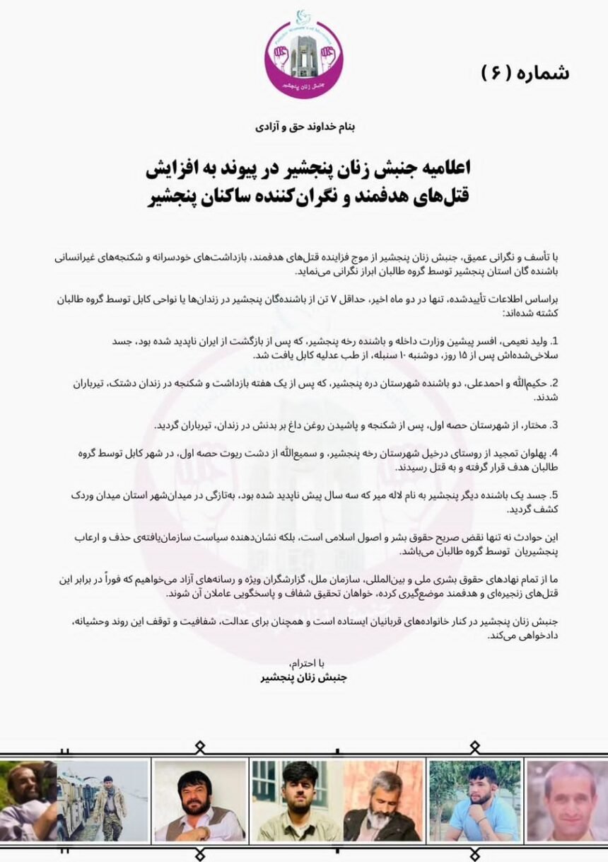 جنبش زنان پنجشیر ضمن محکوم کردن این قتلها، از نهادهای حقوق بشری ملی و بینالمللی، سازمان ملل، گزارشگران ویژه و رسانههای آزاد خواسته است تا به سرعت در برابر این قتلهای زنجیرهای موضعگیری کرده و خواستار تحقیق شفاف و پاسخگویی عاملان شوند. در اعلامیه آمده است که جنبش زنان پنجشیر همچنان در کنار خانوادههای قربانیان ایستاده و برای عدالت، شفافیت و توقف روند خشونتهای سازمانیافته دادخواهی میکند. این گزارش تاکید میکند که وضعیت حقوق بشر در پنجشیر تحت سلطه طالبان، بار دیگر چالشهای جدی در زمینه امنیت، عدالت و حفاظت از جان و کرامت شهروندان را آشکار کرده است.