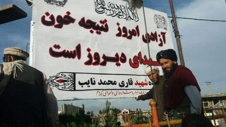 گروه طالبان در لوحهی نصب شده بر چهارراهی دهن میدانهوایی بگرام نوشتهاند: «آزادی امروز محصول خون شهدای دیروز است.»