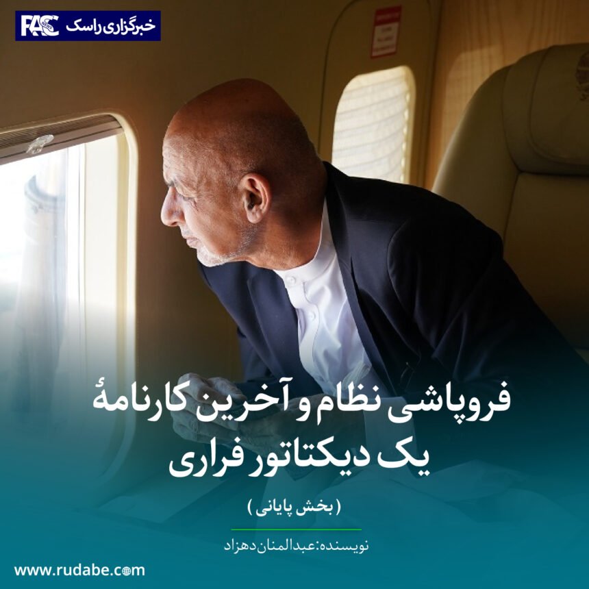 ذبیحالله مجاهد، سخنگو و معین وزارت اطلاعات و فرهنک حکومت طالبان، در برنامۀ مستند تلویزیون یک، انتقال پول توسط غنی را نه تنها تأئید کرد؛ بلکه خاطر نشان نمود که ویدیوهای این پولها و پولهایی که باقی مانده نیز وجود دارد. او گفت: «دوربینهای مداربسته نشان میدهد که روز فرار غنی سه موتری پر از دالر که از پرواز مانده بود، به داخل ارگ آورده شده و مورد غارت نیروهای پیپیاس (گارد محافظت ریاست جمهوری) قرار گرفته است». محمد عمر داوودزی یکی از چهرههای مرموز و همه کارۀ جمهوریت کرزی و غنی هم در مصاحبۀ پرده از انتقال پول توسط غنی برداشت و تأئید کرد که غنی با بستههای دالر از ارگ فرار کرد. سرانجام غنی با این رسوایی و شرم تاریخی، مردم افغانستان را رها کرد و ابتدا به ازبکستان و از آنجا به امارت متحده عرب گریخت و نام خود را به عنوان ناسپاسترین و فاسدترین رئیس جمهور کشور، ثبت تاریخ نمود. او زمانی از کشور گریخت که قبلاً همه حامیان و متولیان رژیم جمهوریت را از بدنۀ قدرت دور کرده بود تا در روز تسلیمدهی قدرت، مانع پروژه نشوند. وقتی خود با دو نفر دیگر(محب و فضلی)، قدرت را به صورت کامل در انحصار گرفت. غنی میدانست که این کار او، خیانت تاریخی محسوب میشود و نام او، جزءِ منفورترین نامهای حاکمان جهان باقی خواهد میماند؛ اما چون غنی یک شئونیست و فاشیست بود و بیرون از دایرۀ قوم نمیاندیشید، از خود گذشت تا قومش برای مدتی نا معلومی، برنامههای تمامیتخواهی او و دار و دستۀ فاشیستها را تطبیق نمایند. غافل از اینکه «هنوز بادۀ ناخورده در رگ تاک است».