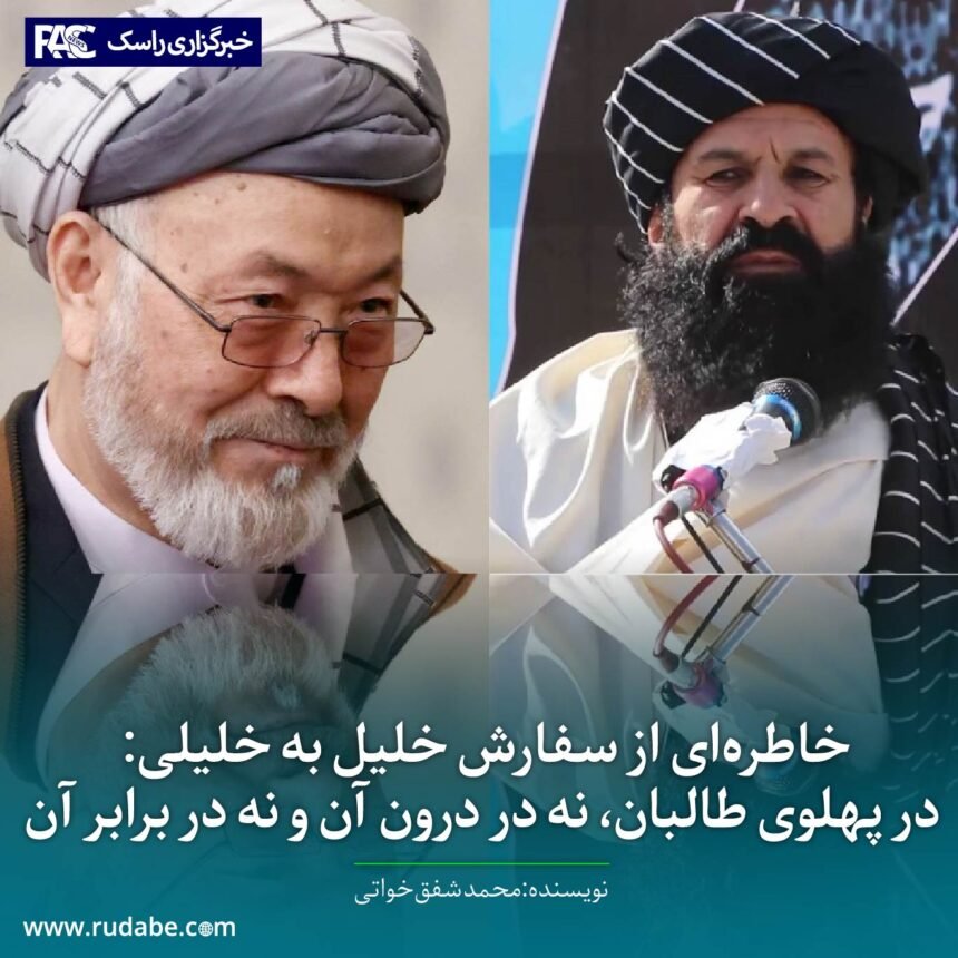 خلیلالرحمن حقانی به آغا صاحب سفارش کردند که با استاد خلیلی هماهنگ باشید، به سفارش من گوش دهید و از رویکرد ما در تعامل با طالبان پیروی کنید. خلیلالرحمن گفته بود که ما پس از ظهور و پیشروی سریع طالبان، فهمیدیم که این سیل قندهار و هلمند، همه را با خود خواهد برد. بنابراین، تقابل با آن عاقلانه نیست، اما در عین حال، نمیخواهیم با ملاعمر بیعت کنیم و کاملا در آنان هضم شویم. فعلا راه عاقلانه آن است که در پهلوی طالبان حرکت کنیم و خود را همراه و همسو نشان دهیم، اما هیچ تعهدی به آنان نداشته باشیم تا ببینیم در آینده چه باید کرد و چه میتوان کرد.