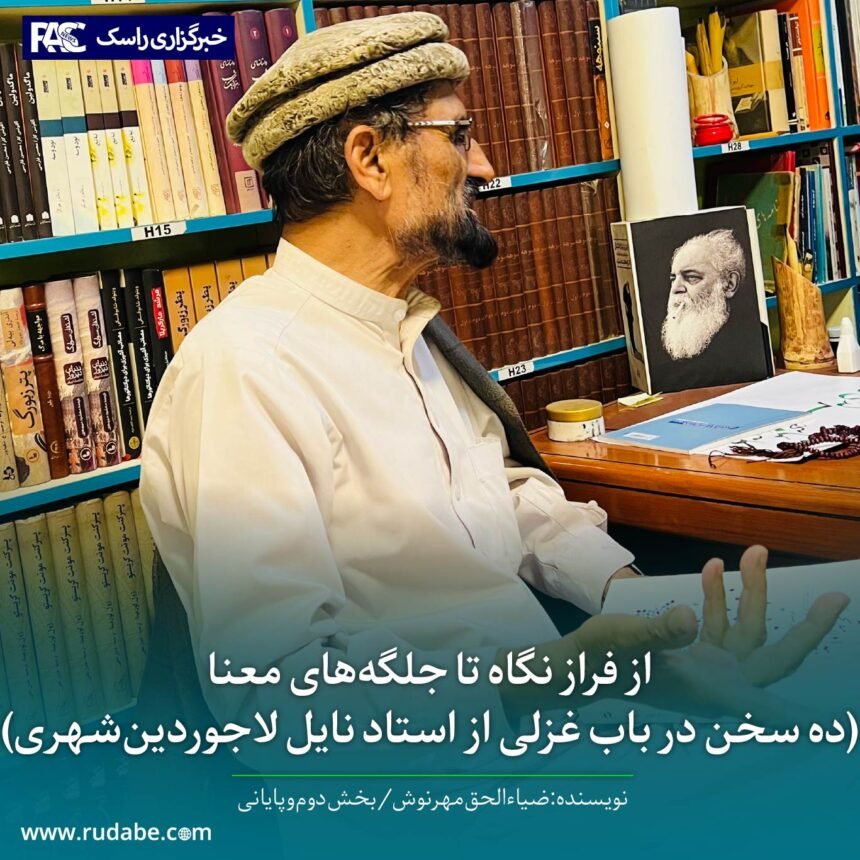 در فرجام و بهمنظور زینتبخشی بهسخنان پراکنده و نامنسجمی که در باب غزل لاجوردینشهری ترتیب کردهام، دست نیاز بهبوستان سخنوری ایشان دراز میکنم و تکبیتی راکه بهگونهیی، بازتابگر کوتاهی دست سخن در راه رسیدن به اوج معانی است، گواه میآورم: