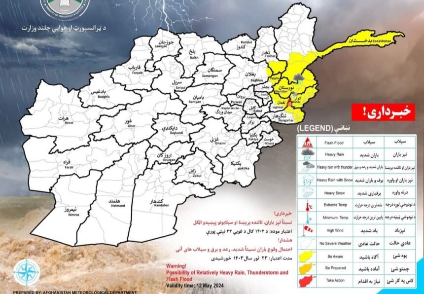 خبرگزاری راسک: ریاست هواشناسی وزارت ترانسپورت و هوانوردی گروه طالبان، از احتمال باران نسبتأ شدید همراه با رعدوبرق و سیلاب آنی در هشت استان کشور خبر میدهد.