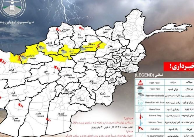 خبرگزاری راسک: مسوولان در ریاست هواشناسی وزارت ترانسپورت وهوانوردی گروه طالبان، می‌گویند، احتمال دارد که فردا، باران شدید، سرازیرشدن سیلاب‌های آنی، رعدوبرق و وزش باد با سرعت قابل‌توجه در ۱۲ استان افغانستان، وجود داشته باشد.