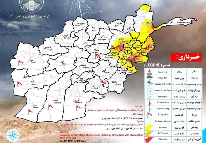 خبرگزاری راسک: ریاست هواشناسی وزارت هوانوردی و ترانسپورت گروه طالبان اعلام کرد که احتمال بارندگی‌ شدید همراه با سیلاب‌ و هم‌چنان وزش بادهای تند در ۱۵ استان کشور وجود دارد.