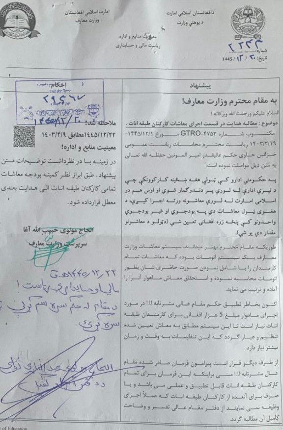 وزیر معارف گروه طالبان روز شنبه، ۹ سرطان، حکم داده که مطابق به پیشنهاد متن معاشات تمامی کارمندان طبقه اناث تا هدایت بعدی مورد معطل قرار بگیرد.یک ماه پیشتر زمان صدور حکم یکسانسازی معاش تمامی کارمندان زن از سوی رهبر گروه طالبان، اسناد منشتر شد که رهبر طالبان معاش