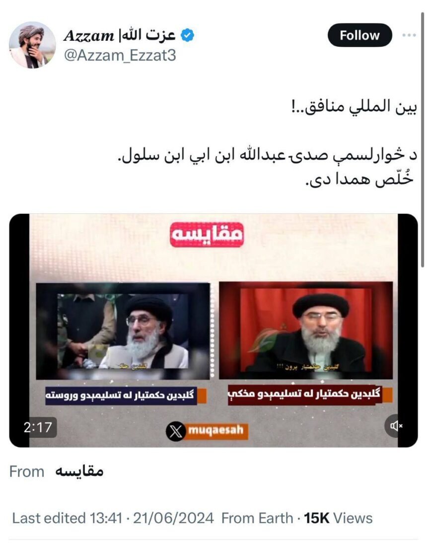 عزتالله، از اعضای طالبان، با نشر ویدیوی گلبدین نوشته است:« این منافق بینالمللی است، همان عبدالله ابن سلول دوران پیامبر است.»