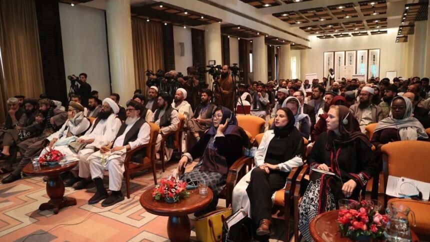 خبرگزاری راسک: در حالیکه طالبان زنان افغانستانی را از حضور در «عرصه عمومی» محروم کرده اند، نمایندگان زن خارجی همچنان در نشستهای این گروه در کابل حضور مییابند. رئیس یوناما و برخی از زنان خارجی دیگر در نشست طالبان درباره تاثیر تغییرات اقلیمی در افغانستان شرکت کردهاند. قانون امر به معروف طالبان، زنان را به چهاردیواری خانه محدود و صدای آنها را در اماکن عمومی «عورت» توصیف میکند.