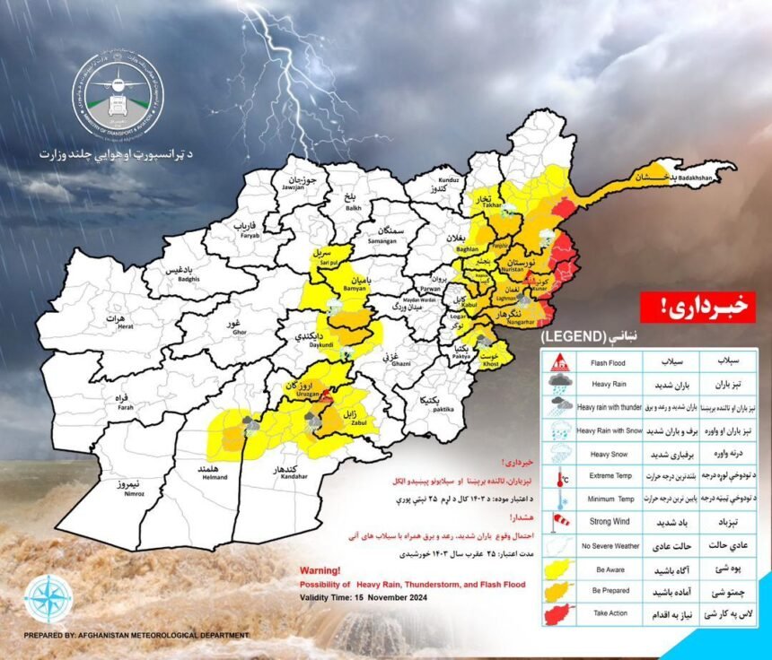 روز گذشته نیز ریاست هواشناسی وزارت ترانسپورت و هوانوردی طالبان گفته بود که احتمال بارندگی در استان‌های بدخشان، نورستان، کنر، ننگرهار، لغمان، کاپیسا، پروان، کابل، لوگر، پکتیا، خوست، پنج‌شیر و برخی مناطق دیگر پیش‌بینی شده است.