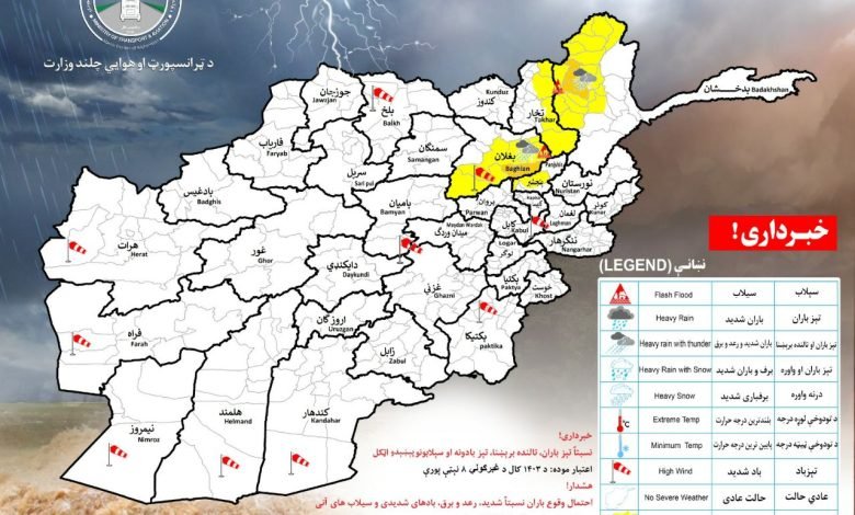 خبرگزاری راسک: ریاست هواشناسی وزارت ترانسپورت و هوانوردی گروه طالبان می‌گوید احتمال بارش شدید باران، سرازیرشدن سیلاب‌ و رعدوبرق در استان‌های مختلف از جمله بدخشان و تخار پیش‌بینی شده‌است.