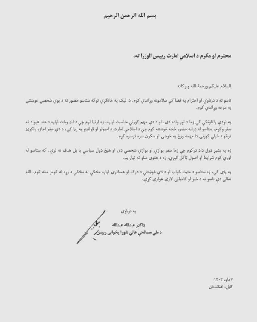 خبرگزاری راسک: دست به دست شدن «اجازهنامه» سفر دکتر عبدالله به هند در میان کاربران شبکههای اجتماعی به موضوع داغ تبدیل شده است. او جهت سفر به هند و اشتراک در عروسی دخترش از ملا حسن آخند رئیس الوزرای طالبان اجازه خواسته است. عبدالله در بخش این «اجازهنامه» از ملا حسن خواسته است که میخواهم به عنوان پدر در روز عروسی دخترم کنار خانوادهام باشم. در متن این اجازه نامه آمده است که «من می خواهم به شما اطمینان دهم که سفر من کاملاً شخصی است و هیچ هدف سیاسی یا دیگری ندارم» عبدالله در آخر این اجازهنامه از خداوند برای او موفقیت آرزو کرده است.