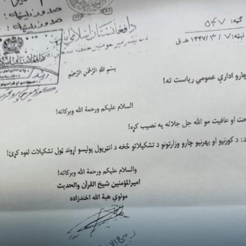 خبرگزاری راسک: بر اساس مکتوبی که به رسانه‌ها درز کرده، ملاهبت‌الله آخندزاده، رهبر طالبان، دستور لغو تشکیلات پولیس بین‌المللی (اینترپل) در وزارت‌های داخله و خارجه این گروه را صادر کرده است. منابع گفته‌اند که این مکتوب حدود دو هفته پیش به ریاست عمومی اداره امور طالبان فرستاده شده و بر اساس آن، بیش از ۱۵۰ کارمند پولیس اینترپل از ساختار وزارت‌های مذکور کنار گذاشته شده‌اند.