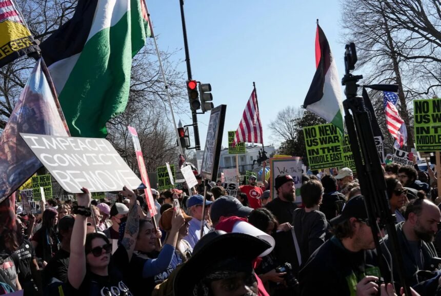 خبرگزاری راسک: روزنامه واشنگتنپست گزارش داد که صدها تن از معترضان روز شنبه در مقابل کاخ سفید گردهم آمدند و با برگزاری تجمع و راهپیمایی، حملات ایالات متحده و اسرائیل به ایران را محکوم کردند. این تجمع بخشی از موج اعتراضهایی بود که در پی حملات نظامی اسرائیل و آمریکا به ایران در شهرهای مختلف ایالات متحده شکل گرفت.