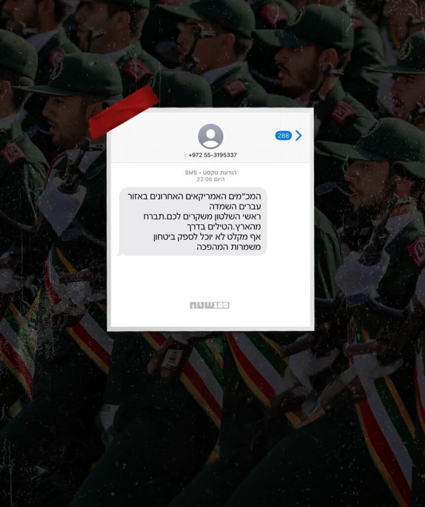 خبرگزاری راسک: بر اساس گزارش رسانه‌های اسرائیلی، پیامی که گفته می‌شود از سوی سپاه پاسداران انقلاب اسلامی ارسال شده، به تلفن همراه برخی شهروندان در اسرائیل رسیده و در آن از مردم خواسته شده است این کشور را ترک کنند.