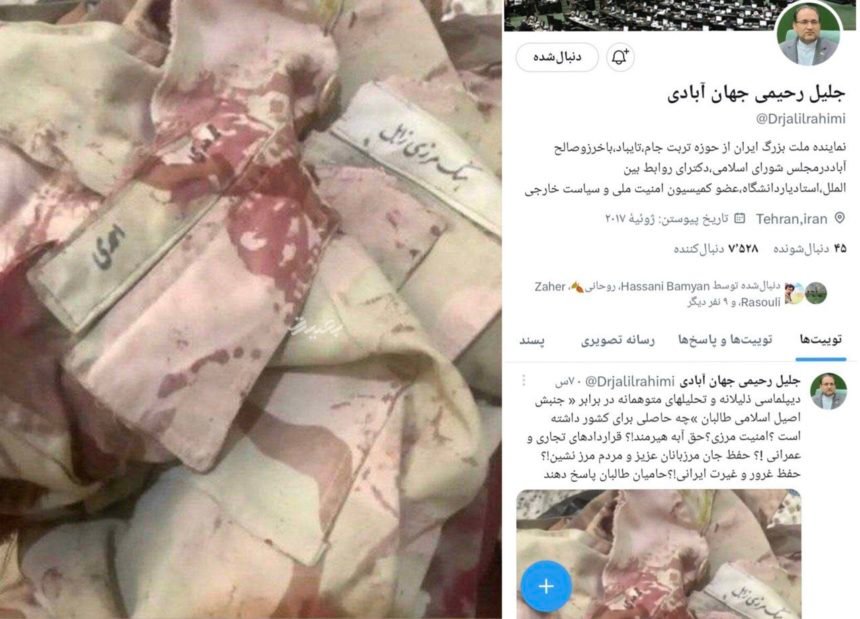 راسکRASC: جلیل رحیمی جهان‌آبادی نماینده‌ی مجلس ایران در توییتی با عکس لباس نظامی مرزبان ایرانی که توسط طالبان کشته است از سیاست حکومت ایران در قبال طالبان انتقاد کرده و از حکومت ایران پرسیده با دیپلماسی ذلیلانه در برابر طالبان و تحلیل‌های متوهمانه از این گروه، چه حاصل و دست‌آوردی داشته‌اید.